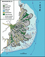humide. Le courant balayant le détroit de Makassar (de direction nord-sud) a pour effet de perturber les dépôts sableux qui se concentrent dans les parties centrale et sud du delta. La fraction pélitique est répartie sur un large périmètre et se retrouve très loin vers le