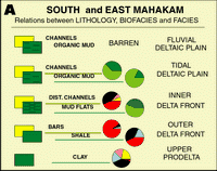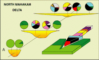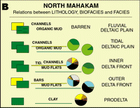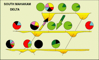 From all these observations it is possible to propose a general model of distribution, particularly for the southern and eastern parts of the delta; the northern part is more specific in nature. This model is now widely used for the interpretation of Upper Neogene deltaic sediments in the Mahakam