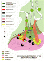 The Mahakam delta is a mixed, fluvial and wave dominated delta located in the eastern part of the island of Borneo (the East Kalimantan province of Indonesia). The distribution of benthic fauna in this delta system is influenced by the combined or antagonistic action of three main parameters: fluvial input of fresh water and sediment, tide, and a strong regional north to south drift current. A model of the present-day faunal distribution has been established taking into account the perturbations induced by the tide and by the regional drift current. This model has been extrapolated into the recent past through the study of shallow cores that permit the reconstruction of late Holocene deltaic regression patterns.