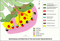 Figure 9: South East Mahakam: delta biofacies distribution. This sketch shows the general distribution of the main Foraminiferal taxa in relation to the topographical and sedimentological pattern.