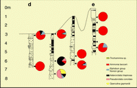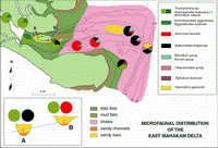 delta front channels. The main feature is the penetration of calcareous taxa (colored arrow) in the bottom channels (drift current, tide). For colors coding, see Fig.