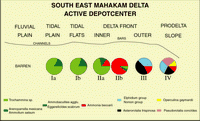 Figure 15: Biofacies distribution in the regressive deposits of the Mahakam delta. Most useful is information regarding the association of sandy sediments and various calcareous taxa (including large benthonics like Operculina). In many previous studies this association was interpreted as indicating inner shelf sand deposits. In fact this association indicates