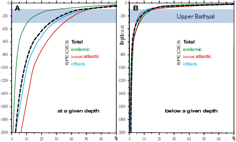 Figure 3: Vertical distribution of 3613 benthic invertebrate species in the Mediterranean Sea: A. percentage of the three categories at a given depth; B. percentage of species living below a given depth (data from Médifaune, & , 1983). |