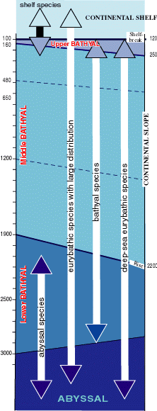 Figure 4: Vertical distribution of the several categories of species between the outer continental shelf and the Abyssal zone (modified, from , 1970; , 1970). The range of the bathymetric limits of Bathyal zone and subzones on the continental slope and of the Abyssal zone are given (dotted: the limits of the subdivisions of the middle Bathyal zone). |
