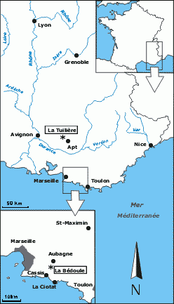 Figure 1: Localisation géographique des stratotypes historiques du Bédoulien et du Gargasien. |