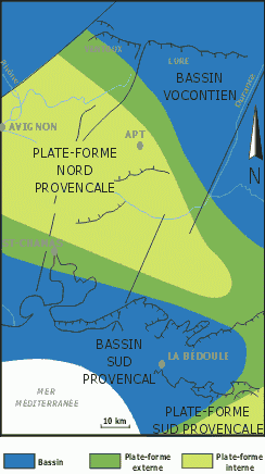 1976), diminuant de profondeur en allant vers l'Est et plutôt d'obédience pyrénéo-provençale, donc en direction de l'Ouest, pour ce qui est de ses relations avec la mer ouverte. En revanche à cette époque la région d'Apt participait du revers nord de la plate-forme nord-provençale et apparaissait ainsi plutôt s'ouvrir, de par sa position géographique, vers le bassin vocontien au NE