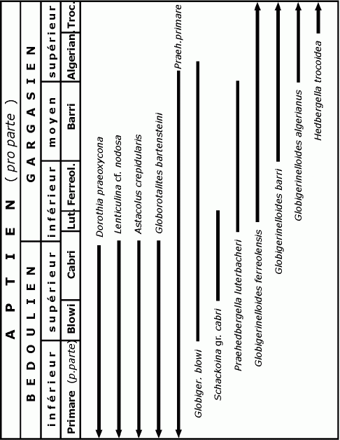 Bédoulien supérieur : Tritaxia pyramidata, Falsogaudryinelles, Lenticulines "lisses" (c'est-à-dire non ornementées : L. gr. gibba-nuda), Gavelinelles.