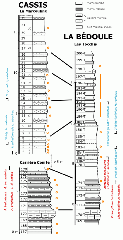 d'Astacolus crepidularis et de Lenticulina cf. nodosa, FO de Praehedbergella luterbacheri), bien positionnés aux Tocchis, ne peuvent ainsi être localisés à Cassis, car ils se produisent très vraisemblablement au sein de la zone non affleurante. Sur la base de la coupe des Tocchis, on peut cependant estimer l'épaisseur de cette lacune de visibilité à Cassis à au moins 5 mètres, peut-être un peu plus si l'on tient compte de la dilatation plus forte de la série évoquée ci-dessus. Il en résulte qu'au-delà du banc repère 170, il n'y a pas homologie directe banc à banc entre les deux coupes, ce qui implique de différencier la numérotation des bancs des Tocchis par l'adjonction du suffixe "-T".