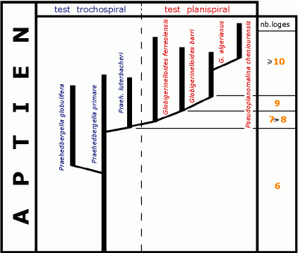 Figure 6 : Évolution au cours de l'Aptien du mode d'enroulement et du nombre des loges chez une lignée de Foraminifères planctoniques initialement à test trochospiralé et 6 loges au dernier tour.