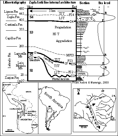Figure 1: Location map of the study area, in the Sierras Subandinas, north-west Argentina. Ordovician and Lower Silurian stratigraphy of the Sierra de Zapla, recognized sequences, lithologies and sea-level curve from & , 2003.