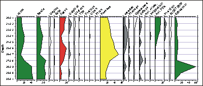 Core W IV was sampled at 2.5 cm intervals and macerated for pollen analysis, for recording of ash weight/dry peat weight and for isolation of the first occurrence of small (1mm or less) fragments of quartzite in the calcined peat. The new core W VI was sampled