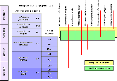 Figure 1: Biostratigraphic extension of selected species observed in the Ronquières and A1-69 borehole sections. The green and yellow rectangles represent the stratigraphic range of the samples containing megaspores. Biostratigraphic scale after et alii (1987).