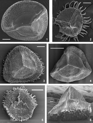 The labra of the trilete mark can be very high (up to 35 µm) to nonexistent and curvaturae may or may not be present. Their ornamentation can consist of grana, coni, spinae, large appendices, or
