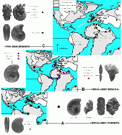 Figure 1: Paleogeographical origin and distribution of the main ammonite groups. Late Cenomanian to Early Turonian interval. Palinspastic maps modified from (1987) and et alii (1991).