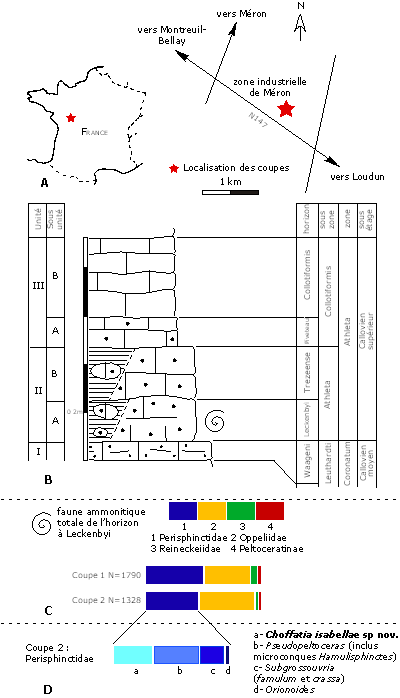 Figure 1 : Données géographique, lithologique, stratigraphique et faunique des coupes de la zone industrielle de Méron (Maine-et-Loire). A : localisation des coupes ; B : lithologie et biostratigraphie ; C : faune ammonitique totale ; D : les Perisphinctidae dans la faune ammonitique totale.