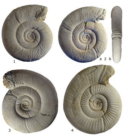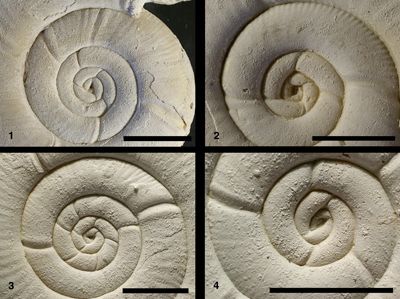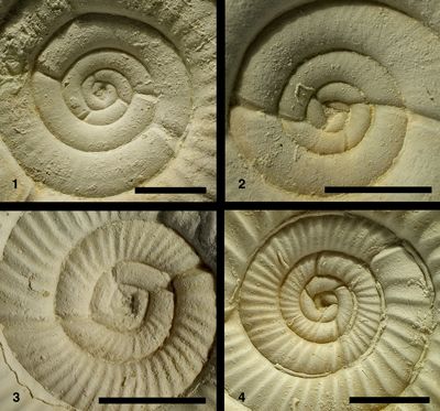 Figure 3 : Enroulement et ornementation initiaux de Choffatia isabellae macroconque. Barre = 1 cm. 1-2 : Stade lisse très long puis costulation initiale discrète – Enroulement initial peu perturbé (1 : spécimen Mbe9721 ; 2 : spécimen A11). 3-4 : Stade lisse court, puis costulation forte – Enroulement initial fortement perturbé (3 : spécimen I11 ; 4 : spécimen Mbe0217).