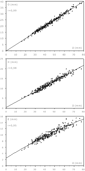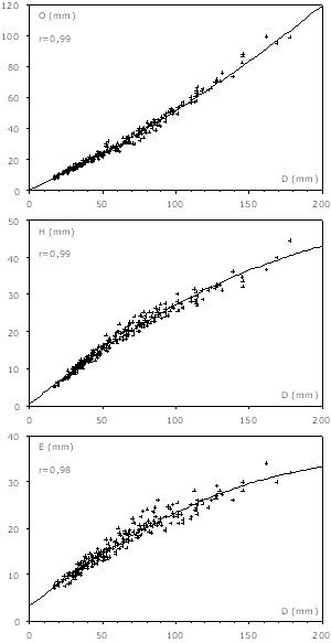 Figure 10 : Courbes de croissance des microconques. O : ombilic ; H : hauteur ; E : épaisseur ; D : diamètre ; r : coefficient de corrélation.