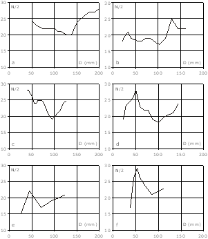 Figure 5 : Courbes de costulation des macroconques. a : spécimen Mbe/n/223 ; b : spécimen C40 ; c : spécimen Mbe/n/221 (holotype) ; d : spécimen Mbe9411 ; e : spécimen H6 ; f : spécimen Mbe/n/2218. N/2 : nombre de côtes par demi-tour ; D : diamètre.