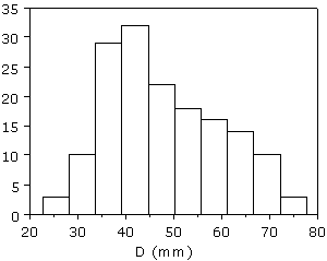 La légère dissymétrie (médiane = 42 mm) de l'histogramme
