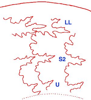 Figure 12 : Ligne de suture du microconque (d'après photo numérique). LL : lobe latéral ; U : lobe suspensif ; S2 deuxième selle latérale.