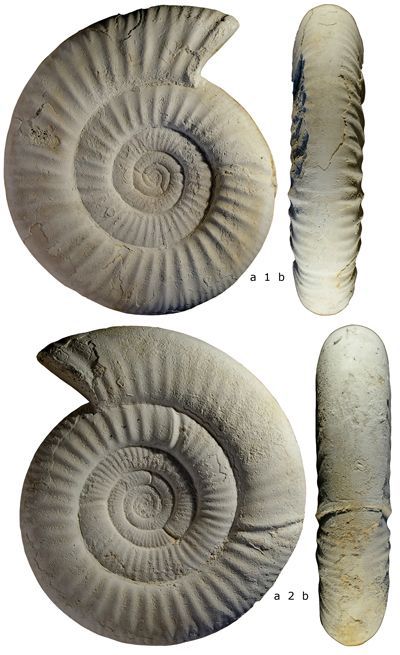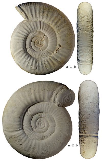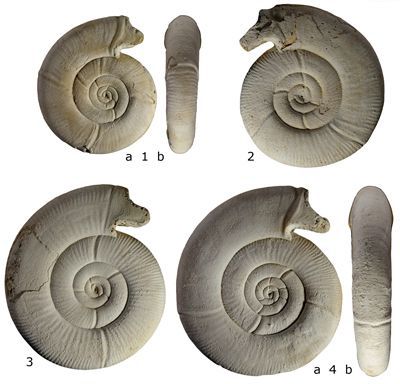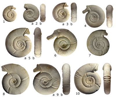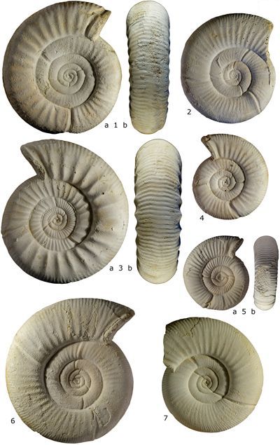 (1988), mais il s'agit là encore de formes plus récentes, à constrictions beaucoup moins nombreuses, dont la croissance en épaisseur est plus forte (à l'origine d'une section déprimée) et qui présentent des côtes franchement proverses dans les tours internes et des côtes secondaires fortes sur la chambre d'habitation.