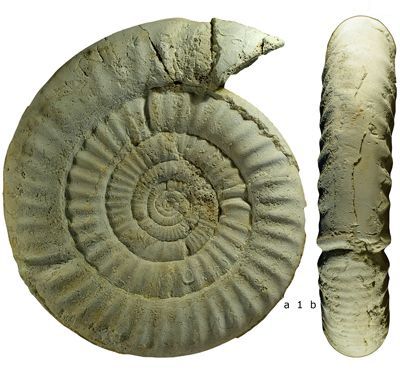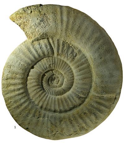 Fig. 1 : Subgrossouvria famulum () macroconque adulte. Observer les côtes radiales, l'écartement et l'épaississement progressifs des côtes, le stade lisse précédant le péristome, les constrictions peu fréquentes sur le phragmocône et absentes sur la chambre d'habitation. Spécimen A16, collection PF. D = 121 mm.