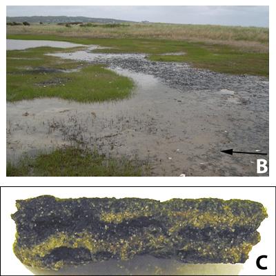 2008). The marsh is protected by sand dunes from wave activity and is flooded with an influx of marine water with the tide. The intertidal mats have been the focus of numerous biogeochemical investigations ( et alii,
