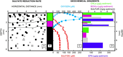 Figure 2: Sulfate reduction rate approximations (panel A) are reported with depth for each of the green, pink and black layers (top to bottom) presented in panel B. Squares in panel A indicate the presence of Ag235S; the higher sulfate reduction rates are depicted by darker pixels. The panel represents a two-dimensional map of sulfate-reduction. Horizontal distance measured is indicated on the x-axis of panel A, and depth in millimeters is reported on the y-axes for all panels. Microelecrode depth profiles of oxygen and sulfide are shown in panel C: Oxygen (blue squares) and sulfide (red triangles) for both light and dark conditions are represented by closed and open symbols, respectively. Geochemical depth profiles are shown in panel D per layer as determined by panel B for (top to bottom): Chlorophyll a (green), bacteriochlorophyll a (pink), elemental sulfur (gray), and exopolymeric substances (EPS) (blue). The varying thickness of the bars in panel D is reflective of the difference in thickness between the mat layers.