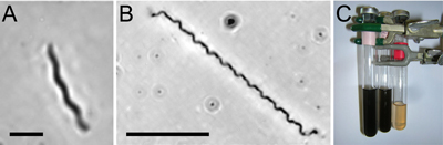 Figure 3: (A & B) Two representatives of spirochete morphotypes observed in spirochete enrichment cultures (bar = 10 μm). (C) Uninoculated modified marine broth medium (far left tube) and spirochete enrichment culture at five days (middle tube) and fifteen days (far right tube). The formation of polysulfides is indicated by the yellowish hue (far right tube). The volume in the far right tube is less than the others because this tube was photographed immediately following sampling. The head space in all cultures was maintained anoxic.