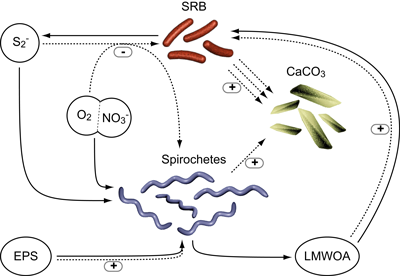Figure 4: Conceptual model of the role of spirochetes in microbial mat biogeochemistry. Through sulfide removal (using oxygen or nitrate) and degradation of exopolymeric substances (EPS), spirochetes stimulate sulfate-reducing bacteria (SRB), thereby enhancing long-term preservation of microbial mats through calcium carbonate precipitation. EPS degradation by spirochetes also results in calcium liberation and formation of nucleation sites for CaCO3 precipitation. Solid lines indicate flow of materials, dotted lines the interactions between reservoirs (sulfide, EPS, oxygen, nitrate, low-molecular weight organics (LMWOA) and calcium carbonate crystals) and microorganisms (spirochetes and SRB, respectively). "+" and "-" represent stimulatory and inhibitory interactions, respectively.