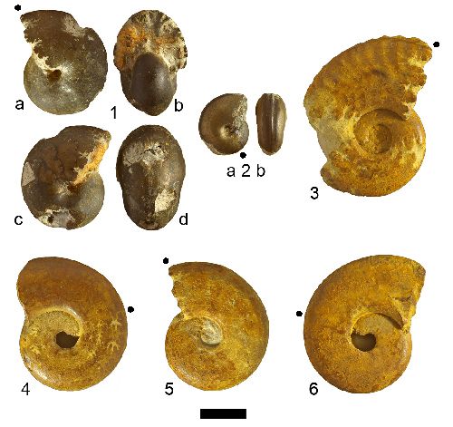 figs. 1.a-d & 2: Sphaerodomites cf. calcarata ; fig. 3: "Hecticoceras" aff. gourbinei de ; figs. 4-6: Glochiceras ? (ex Cadomoceras) cossmanni de .- Black dot: last visible suture; scale bar = 1 cm.