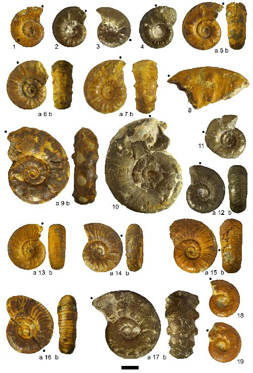 figs. 1-11: Euaspidoceras freii morph freii macroconch; figs. 12-16: Euaspidoceras freii morph niedzwiedskii () microconch; figs. 17-19: Paraspidoceras sp.- Black dot: last visible suture; scale bar = 1 cm.