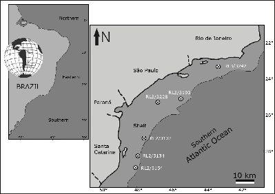 The continental shelf of Brazil includes three associations of ostracodes: Southern, Transitional and Northern/Eastern ( & , 1989). On this huge shelf, Krithe gnoma & , 1999, is restricted to that portion of the Southern association under the influence of the Malvinas current ( & , 1999).