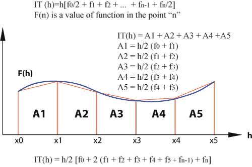 vestibula. Usually, this method is used to calculate irregular areas. It consists of iterating the results calculated for an integral through the trapezium method for different "h". These "h" must belong to a geometric progression divided by two. For the trapezium method, the inferior area is divided in a series of trapeziums, whose base is "h" and height is the value of a function in a given point,
