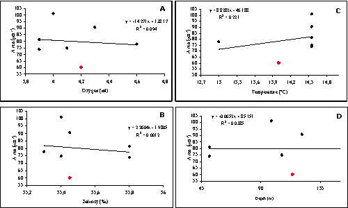 1999. Os pontos pretos indicam as seis valvas esquerdas adultas [A: Oxigênio (ml) B: Salinidade (‰) C: Temperatura (°C) D: Profundidade (m)]