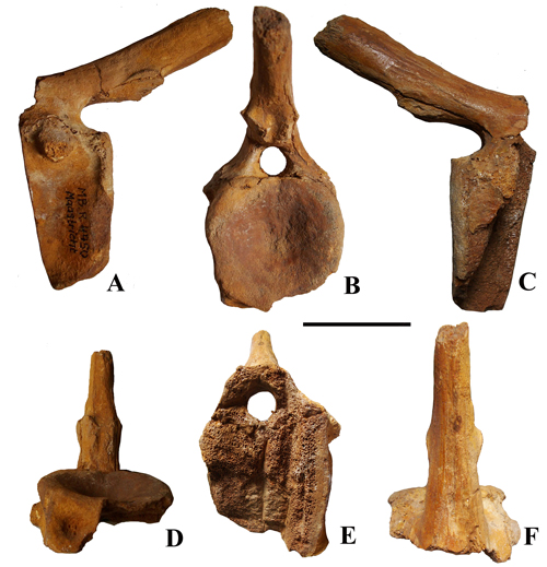 Figure 1 : Vertèbre caudale d’hadrosauridé du Maastrichtien de la région de Maastricht, Museum für Naturkuned, Berlin, n° MB. R. 4450, en vues latérale gauche (A), caudale (B), latérale droite (C), ventrale (D), craniale (E) et dorsale (F). Échelle graphique : 50 mm.