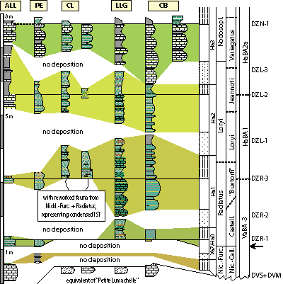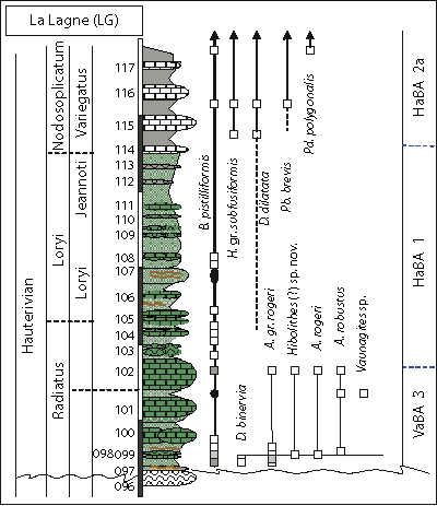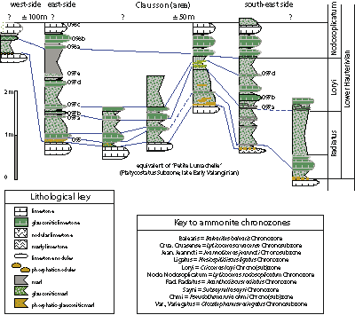 ; middle and right lithological columns), for here the section is comparable to the succession exposed near La Lagne. In addition, glauconitic levels occur near the top of the