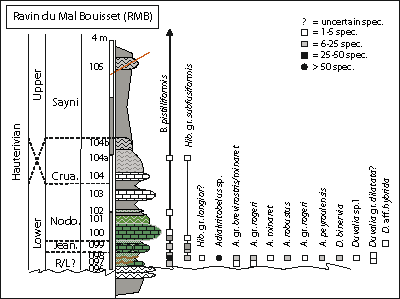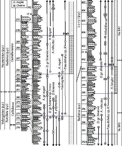 1999; , 2002) and the distribution of belemnites. The sections encompassing the Valanginian-Hauterivian boundary are particularly rich in belemnites. Some of them show traces of reworking, rolling or physical damage. The majority of the macrofossils are cephalopods.