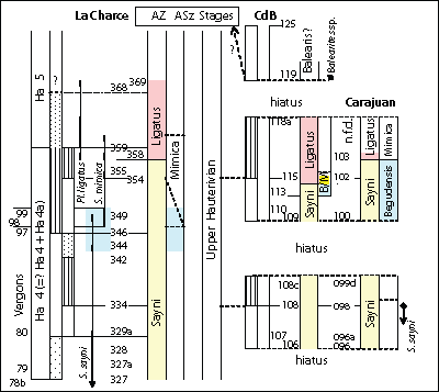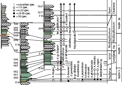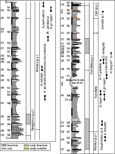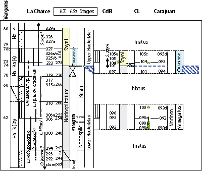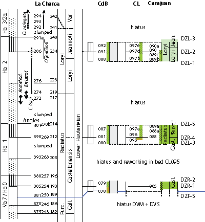 In the sections we measured there are many small faults. So we could not compare our profiles directly with the succession depicted by (1995, fig. 32; in particular as regards the thickness of the C. loryi Subzone) and also because bed 112d (base of Acanthodiscus radiatus Biozone in et alii, 1991, fig. 6) could not be recognized. With these two exceptions, their bed numbers could be correlated with a fair degree of reliability. A basal conglomerate appears to be present only rarely in the Allaves area.