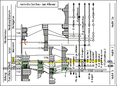 ): Exposures in the area between Les Allaves and the Ravin du Carrîne are typical condensed outer-platform deposits with many variations in lithology. In contrast to the Peyroules area, strata of latest Early Valanginian to Late Valanginian age in the Les Allaves area are rich in marls with abundant echinoids and belemnites. Generally, the ammonite zones that characterize the Late Valanginian are expressed in only a few thin limestones, separated by relatively thick marls