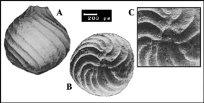 : utricules de Clavatoracées (charophytes) du Crétacé inférieur (Barrémien inférieur-supérieur) du Haut-Atlas central (Maroc). A1-A3 : Atopochara trivolvis triquetra . B1-B3 : Globator trochiliscoides . C : Flabellochara harrisi () . A-C : synclinal d'Aït Imelloul (éch. IM1I-J), partie inférieure de la Formation du Jbel Sidal (Barrémien supérieur : M8a), MHNG 60537. D-E-F : Globator mutabilis () , synclinal d'Aït Attab, partie sommitale de la Formation des Iouaridène et partie basale de la Formation du Jbel Sidal (Barrémien inférieur : M7b), MHNG 60537. D : éch. AT 89ch. E1-E2 : éch. AT 88. F1-F5 : éch. AT 77. A1-A2-B1-B2-B3-C-D-E1-E2-F1-F2-F5 : vues latérales. A3 : vue apicale légèrement oblique. B3-F3-F4 : vues basales. B3 : vue basale de détail de B2 (partie inférieure d'un faisceau dépourvu de cellule basale). F4 : vue de détail de F3 (avec cellules basales vestigiales filiformes). F5 : moule interne d'un utricule de très grande taille et non calcifié portant des traces de spiralisation. N.B. : de tels vestiges d'utricules géants apparaissent de même dans le N.-E. de l'Espagne (Maestrazgo) dans la population-type de l'espèce G. mutabilis (éch. LR2, Les Rases).