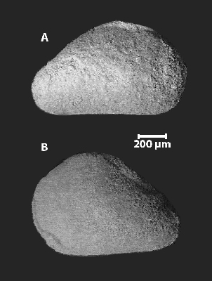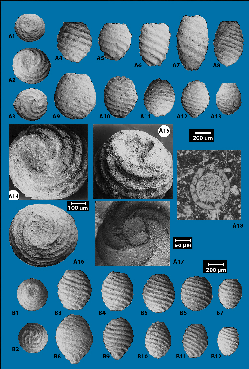 : gyrogonites de charophytes du Jurassique moyen (Bathonien - ? Callovien) du Haut-Atlas (Maroc). A1-A18 : Aclistochara africana n.sp.(Characées), Formation d'Anoual (Bathonien), synclinal d'Anoual (A1-A17 : éch. KM6b du "Membre supérieur marin" / A18 : éch. F10 de la partie supérieure du "Membre inférieur détritique"), Haut-Atlas oriental, MHNG 60562. A14-A15-A16 : vues de détail montrant la dépression apicale "en rosace" constituant un opercule caractéristique du genre Aclistochara (ici partiellement masqué par du sédiment résiduel). A17 : vue interne d'une gyrogonite cassée montrant la plaque basale composée (bipartite). A18 : section axiale sagittale en lame-mince montrant une paroi épaisse à calcification "en éventail" (ou "en Y") caractérisant un paléomilieu lagunaire saumâtre, collection H. (Oujda), nombreux autres spécimens identiques dans les lames-minces AN38-39 (MHNG 60579'-79"). A2-A4-A14-A15 : même gyrogonite (holotype) ; A1/A16-A3, A5-A13 : paratypes. A1-A16 : même gyrogonite. B1-B12 : Porochara hians & (Porocharacées), sommet de la Formation de Tilougguit (ou partie basale de la Formation des Iouaridène ? ; Bathonien - ? Callovien), synclinal d'Ouzoud (éch. ZD1), Haut-Atlas central, MHNG 60538. B8-B9 : gyrogonites à base étirée et pointue. A1-A2-A12-A13-A14-B1 : vues apicales. A3-B2 : vues basales. A4-A11, B3-B12 : vues latérales.