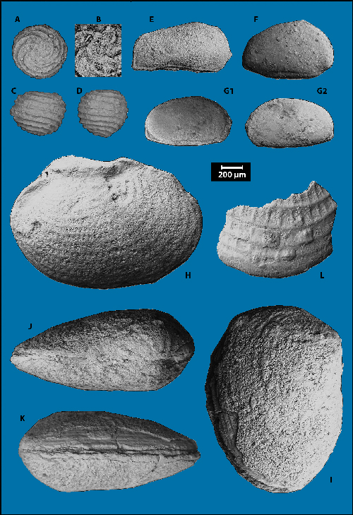 : charophytes (A-D), ostracodes (E-F-G) et lamellibranches lacustres (H à L) du Jurassique supérieur (Oxfordien ?–Kimméridgien, partie inférieure de la Formation des Iouaridène) du Haut-Atlas central (Maroc). A-D : Aclistochara bransoni emend (Characées), éch. I5 (synclinal d'Aghzif-Naour), MHNG 60538. A-B-C : même spécimen. A-B : vues apicales. B : vue de détail de la dépression apicale "en rosace" (au centre) caractéristique du genre Aclistochara. C-D : vues latérales. E : Cypridea suprajurassica n.sp., paratype juvénile à carapace immature (stade larvaire), éch. WO9 (synclinal d'Ouaouizaght), MHNG 60562. F : Cypridea demnatensis n.sp. (paratype), éch. IO E (synclinal des Iouaridène), MHNG 60562. G1-G2 (même spécimen) : Cypridea mohandi n.sp. (paratype), éch. W18 (synclinal d'Ouaouizaght), MHNG 60562. E-F-G : carapaces en vues latérales (externes). E-F-G1 : vues de la valve droite. G2 : vue de la valve gauche. H à L : carapaces bivalves (vues externes) de petits Unionidés (genre