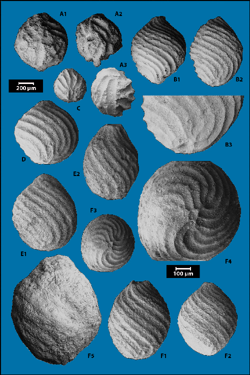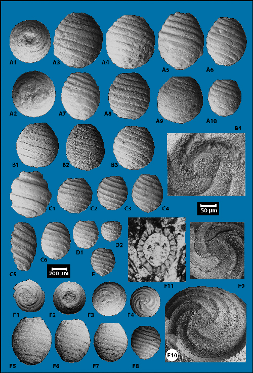 holotype. A1-A2 et A4 à A10, B1 à B4, C1 à C6, D1-D2, E : paratypes. F1 à F11 : Porochara maxima