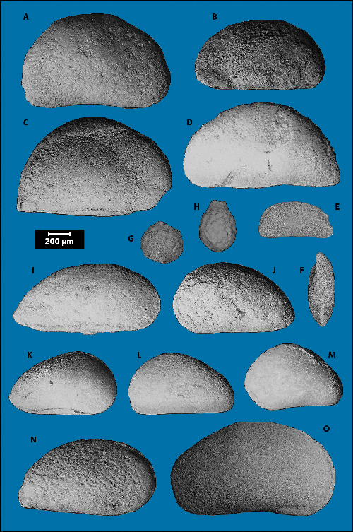 (éch. ATT 14C). O : Reconcavona ? aff. incerta & (éch. W40). A-B-C-D-I-J-N : synclinal d'Aït Attab (éch. ATT 3, ATT 4A, ATT 14C, ATT 15A), partie inférieure ("Membre inférieur") de la Formation des Iouaridène (Hauterivien ? - Barrémien inférieur), MHNG 60559. E-F-G-H : synclinal des Iouaridène (éch. IO64), partie supérieure de la Formation des Iouaridène (Barrémien), MHNG 60559. K-L-M-O : synclinal d'Ouaouizaght (éch. W34.3, W40), partie supérieure ("Membre supérieur") de la Formation des Iouaridène (Barrémien inférieur), MHNG 60560. A-E, I-O : carapaces en vues latérales (externes). A-B-C-I-K-N-O : vues de la valve droite. D-E-J-L-M : vues de la valve gauche. F : carapace en vue ventrale. G-H : utricules en vues latérales (externes), formes évoluées (nodosoclavatoroïdes) n'ayant conservé que la couche cellulaire interne noduleuse.