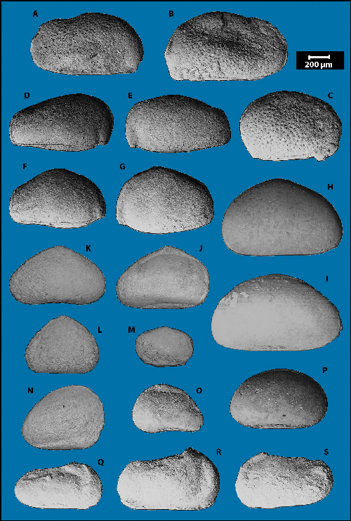 Plate 7: Lower Cretaceous (Hauterivian ? - Lower Barremien) ostracods from brackish to lacustrine (A-P) or marine (presumed Trachyleberididae, Q-S) paleoenvironments of the central High-Atlas (Morocco). A-B: Paracypridea aff. langdoni . C: Paracypridea ? sp.. A-C: Aït Attab syncline (sample ATT 15A), lower part ("Lower Member") of the Iouaridene Formation (Hauterivian ? - Lower Barremian), MHNG 60559. D-E: Cypridea sp. 1 (sample W39). F-G: Cypridea (Sebastianites ?) aff. mataensis (sample W39). H-N: Harbinia atlasica n.sp. (sample W34.3), holotype (H), paratypes (I-J-K-L-M-N), juveniles (larval stages, J-K-L-M) and malformation (N). O: Petrobrasia ? aff. gutta & (sample W34.3). P: Reconcavona ? aff. ultima & (éch. W34.3). Q: cf. Strigosocythere strigosa (), (sample W34.3). R: Cythereis ? sp. (sample W34.3). S: Protocythere ? sp. (sample W34.3). D-S: Ouaouizaght syncline, upper part ("Upper Member") of the Iouaridene Formation (Lower Barremian), MHNG 60560. A-S: shells in lateral views (external): A-C-D-F-I-J-K-N-P: views of the right valve. B-E-G-H-L-M-O: views of the left valve. I with whitish coating on topleft containing baryum (microprobe analysis), manganese also detected in blackish encrusted particles.