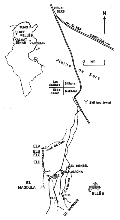 In the explanation accompanying the Ebba Ksour 1: 50,000 geologic sheet, (1979) gives a succinct description of a good outcrop of the Abiod Formation in the sector called El Magoula (or El Mazoula, his page 11). It is undoubtedly the succession that we studied in detail. considers it to be representative, and capable of "serving as an example" of the Abiod Formation in the northeastern portion of the sheet. For him, the thickness of the entire Formation is 235 m, while our measurement is in the neighborhood of 286 m. The author had clearly recognized its tripartite aspect and noted the presence of ammonites of the genus Bostrychoceras near the top of the lower bar and as well the presence of "Globotruncana calcarata" in the "membre marneux moyen" (middle marly member). The chronostratigraphic interpretation is based on the micropaleontologic interpretations of A.-L. and P. of the Tunisian Geologic Survey. They called the lower bar "Upper Campanian", the "membre marneux moyen" "Upper Campanian (upper part)" and the upper bar "Lower Maastrichtian". This evaluation, as will be seen further on, agrees in part with our interpretation, the difference being that we put the Campanian-Maastrichtian boundary well within the upper bar, where it is located on the basis of ammonite collections.