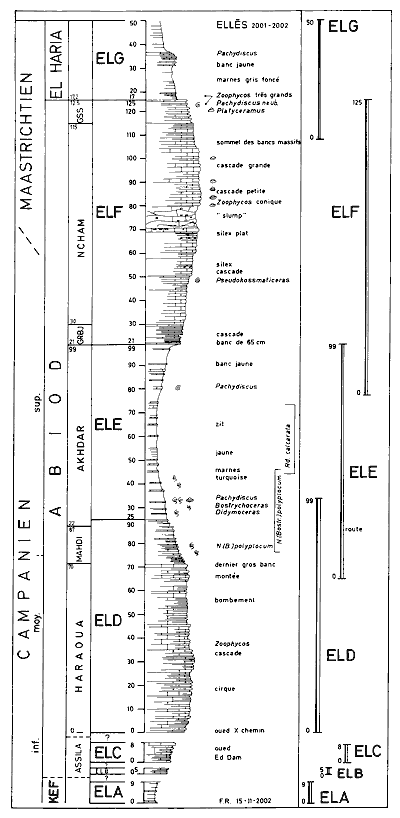 La cascade de base montre un passage progressif - aux environs du niveau ELF 30 - entre les alternances du Membre Gourbeuj (G) et les bancs calcaires à très minces interbancs de calcaire marneux du Membre Ncham (N) ; c'est sur cette ligne G/N que se trouve Moheddine qui donne l'échelle. En remontant sur la droite le lit de l'oued Ed Dam (hors photo), le niveau ELE 48 a livré l'ammonite Pseudokossmaticaras brandti caractéristique de la partie supérieure du Campanien. Par comparaison avec la coupe de Kalaat Senan ( et alii, 2000), la limite Campanien (Cp)- Maastrichtien (Ma) se trouve au-dessus de ce niveau, entre ELF 60 et 70, soit vers ELF 66.