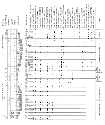 In localities other than those of north central Tunisia the Abiod Formation presents itself less commonly in its "classic" tripartite aspect: sometimes the lower bar is less well developed, sometimes the upper bar is less prominent, and in other localities the formation is an almost monolithic entity, as is the case in certain sections north of Kairouan and in wells in the plain southeast of Kairouan. In order to date more precisely these different lithologies of the Abiod Formation, a section at the southeast edge of the "Tunisian trough" in which sedimentation appears to have been continuous was studied first. It is the Ellès section, about 45 km southeast of El Kef. There, as at Kalaat Senan the beds of limestone and marly limestone contain macrofossils, among them ammonites, along with planktonic foraminifers visible in thin sections, while the marls yield profuse numbers of isolated planktonic foraminifers. The vertical distribution of the planktonic species and the zonation derived therefrom constitutes the basis for stratigraphic attributions in successions where the thickness of the Abiod Formation is greatly reduced, either by lacunae or by the development of a uniformity in lithology caused by an increase in the content of limestones. Later, more precise attributions will make possible isochronic paleogeographic maps that may serve to find lithologic or structural events favorable to the entrapment of fluids such as hydrocarbons.