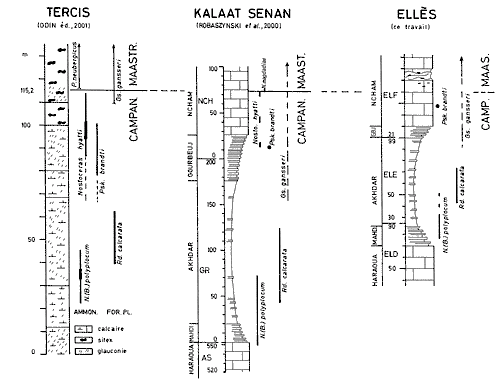 L'un des points d'ancrage de la succession stratigraphique étant la limite Campanien-Maastrichtien (Cp-Ma), on définira la position de cette ligne-temps à Ellès par comparaison avec la coupe de Kalaat Senan et celle du stratotype international de Tercis (France) ratifiée par l'Union internationale des sciences géologiques.